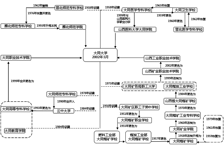 山西大同大学坐落于“中国历史文化名城”——大同,办学历史可以追溯到20世纪50年代。2002年经教育部批准由雁北师范学院、大同医学专科学校、大同职业技术学院、山西工业职业技术学院合并筹建,2006年正式挂牌成立。2016年入选山西省本科高校向应用型转变试点高校,2017年成为山西省唯一的厅市共建高校,2018年获批硕士学位授予单位,2021年成为山西省首批高水平应用型本科高校。