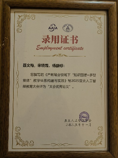 在大会的颁奖典礼上,我院聂文梅、宋晓霞与杨静婷合作完成的论文《产教融合视域下“知识图谱+多智能体”教学体系构建与实践》荣获“大会优秀论文”奖。获奖论文展示了学院在智能教育体系改革和产教融合方面的探索与实践,获得了业界的认可。该论文提出,在产教融合的框架下,构建一个基于“知识图谱”和“多智能体系统”的新型教学体系。通过知识图谱技术系统化梳理产业领域核心知识,形成可视化的动态知识网络;引入多智能体仿真技术,模拟产业协同场景,让学生在模拟环境中进行智能体的设计、编程与调度,解决实际问题,从而培养其系统思维和工程协同能力。这一创新模式有效解决了工程教育中理论与实践脱节的问题,实现了知识学习从“碎片化”到“体系化”的转变,推动了学生从“被动接受”到“主动建构与协作”的转变。实践表明,该教学体系为解决产教融合不足、培养复合型工程人才提供了新范式。这一成果与大会主论坛中“学科融合”、“实践创新”及“产学研协同育人”等核心议题高度契合,为人工智能时代教育改革提供了具有同大特色的解决方案。